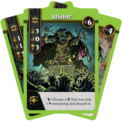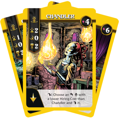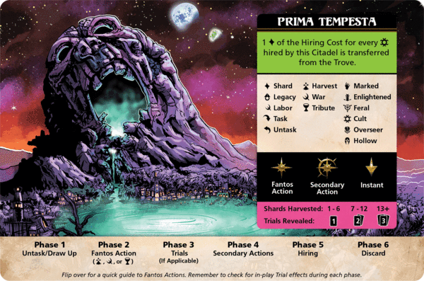 Once hired, a Legacy can be tasked to Harvest more Shards, go to War with a neighboring Citadel, or be nominated a Tribute of Fantos. Or, the Legacy may use its special ability to the detriment (or benefit!) of others. A Legacy may also play Labor cards from the player's hand using its own shard currency. The Labor cards can either help the player's Citadel or Legacy, or target others.