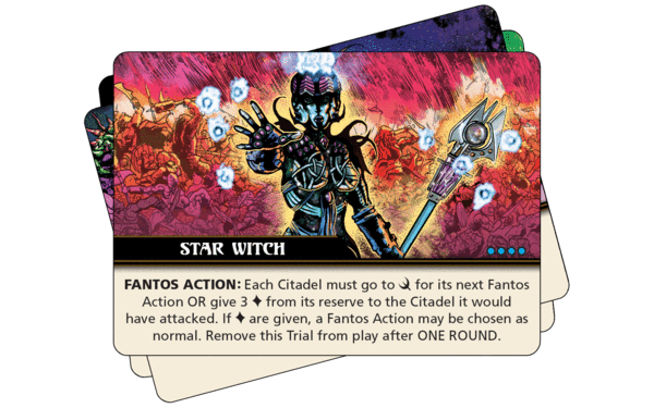 Every time a Citadel chooses to Harvest from the planet's Iridium Trove, it contributes further to the environmental pollution of Fantos. Zodraz's punishment for this is forcing the Harvesting Citadel to draw new cards from the Trials Deck depending on the result of the Harvest. Life on Fantos becomes increasingly difficult as new challenges rain down from the stars and force dissent and diplomacy between the Citadels.