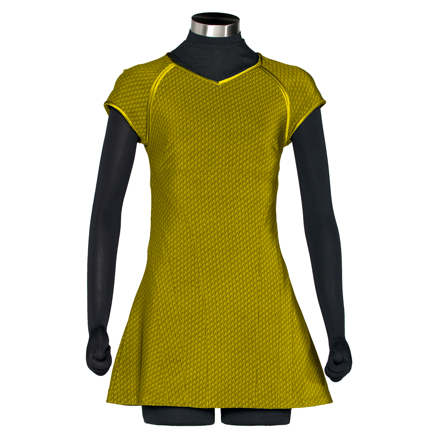 Faithful replica of the dress worn in the Star Trek™ movies directed by J.J. Abrams. Replicated using patterns from screen-used uniforms, dresses are made of Jumbo Spandex featuring intricate Starfleet delta pattern that is printed and dyed to match coloring used by production. Cap sleeves as worn by primary characters throughout the movies.