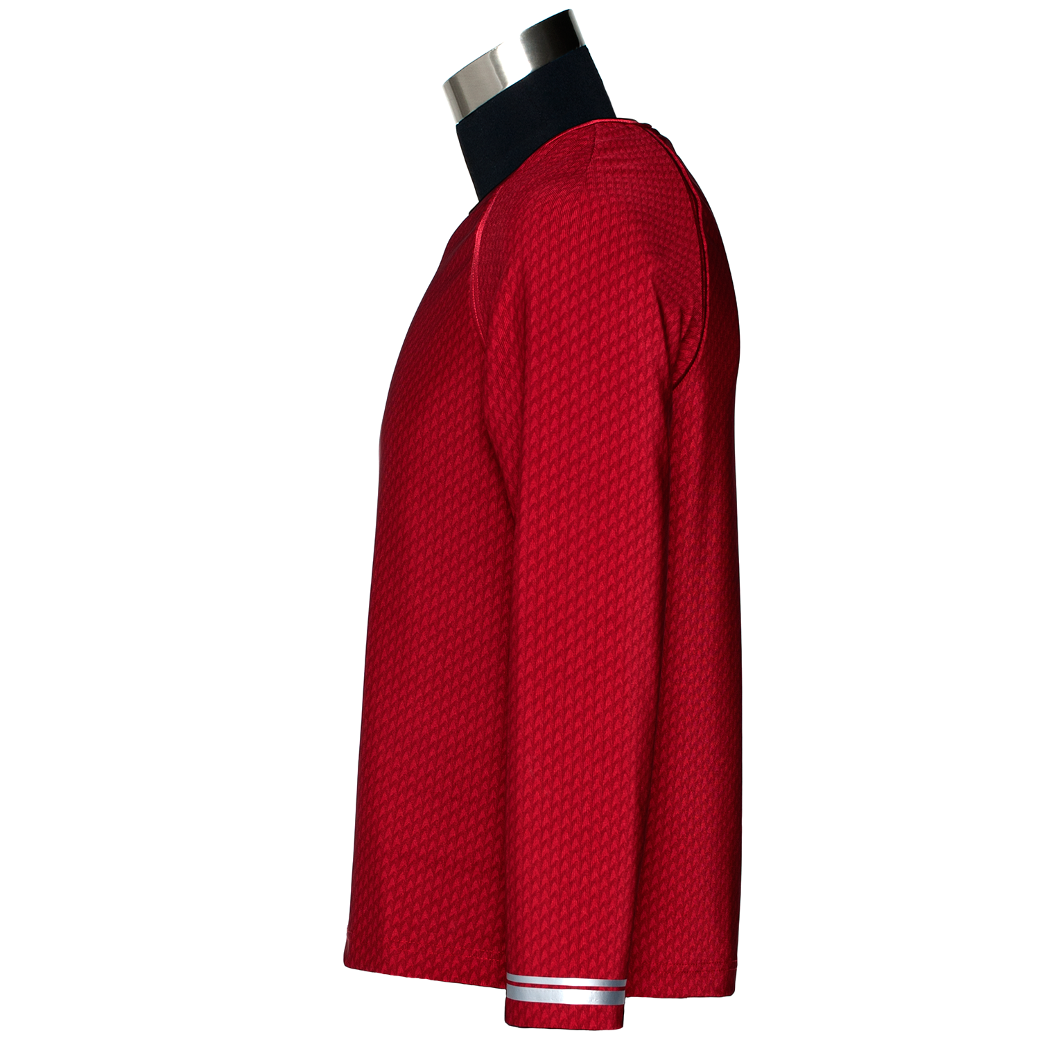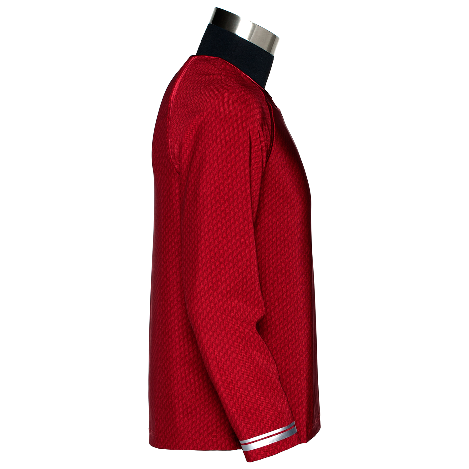 Faithful replica of the tunic worn by Montgomery "Scotty" Scott in the Star Trek™ movies directed by J.J. Abrams. Replicated using patterns from screen-used uniforms, this tunic is made of Jumbo Spandex featuring the intricate Starfleet delta pattern print and dyed to match coloring used by production. Character specific Lieutenant Commander heat appliqué rank stripes, as seen in film.