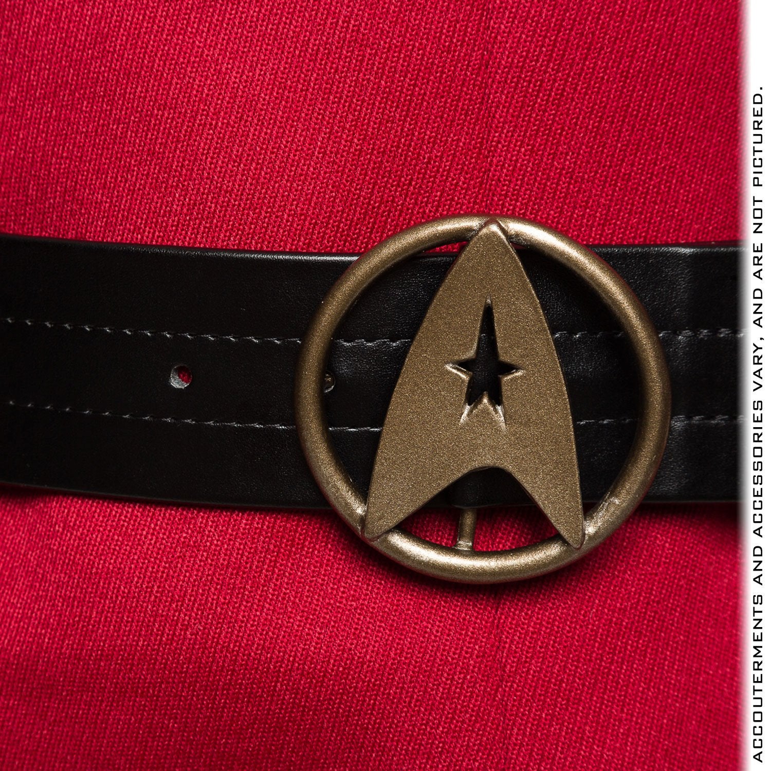 - INCLUDED: Leather adjustable belt with Starfleet belt buckle, replicated from screen-used piece. Metal Starfleet ringed delta belt buckle painted bronze metallic, recreating the look and finish as executed on screen used buckles.