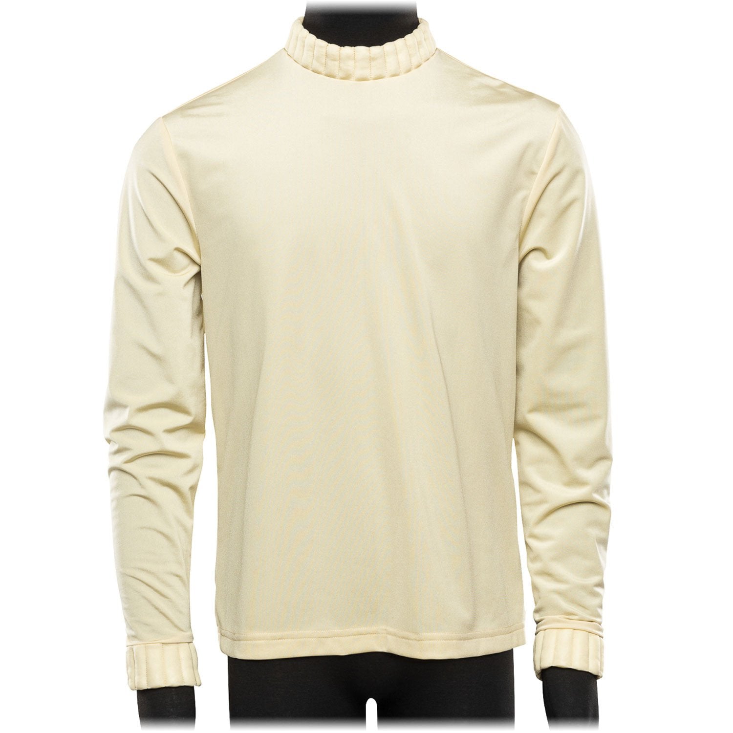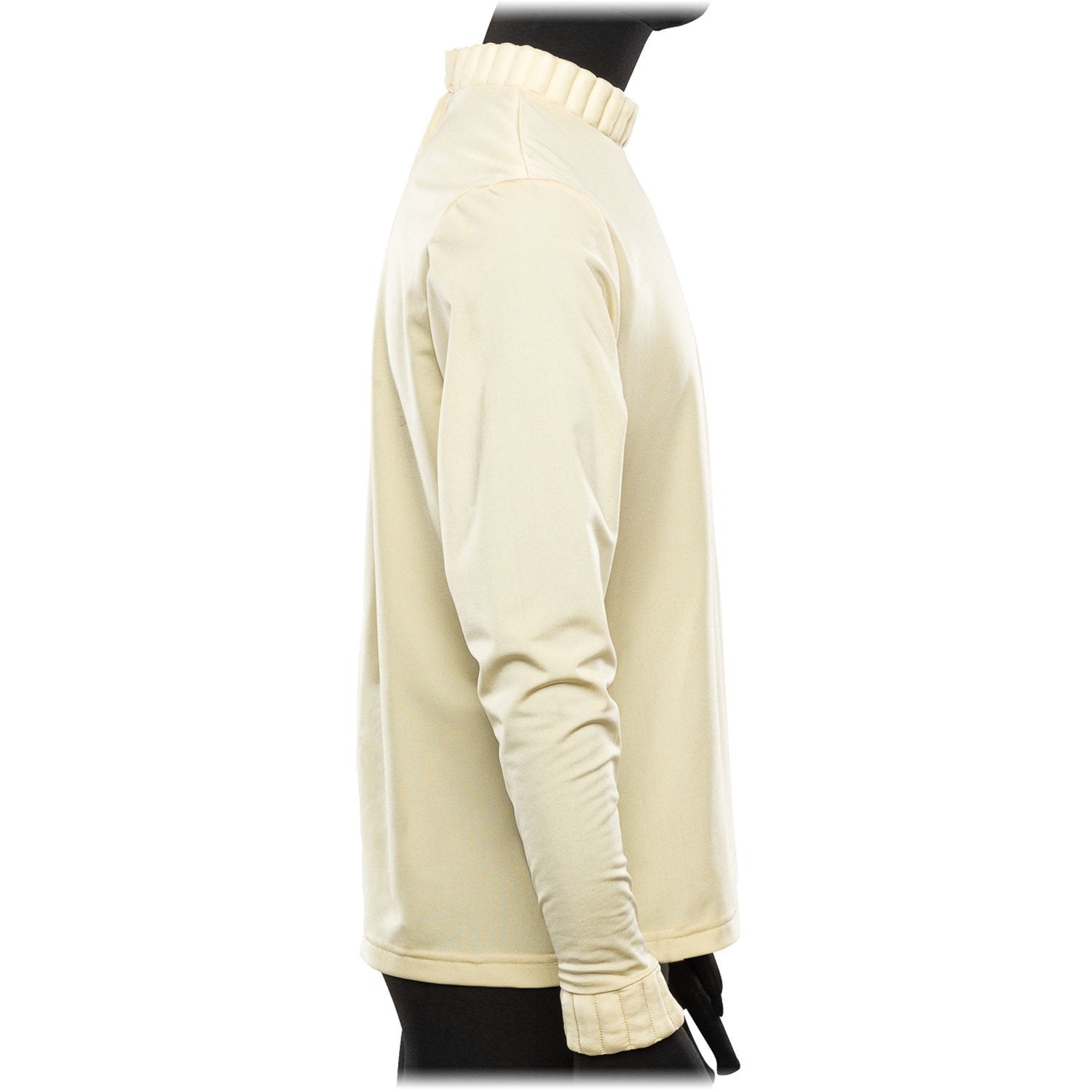 - Fine synthetic fabric in command ivory with hand-stuffed trapunto quilting on the collar and cuffs.