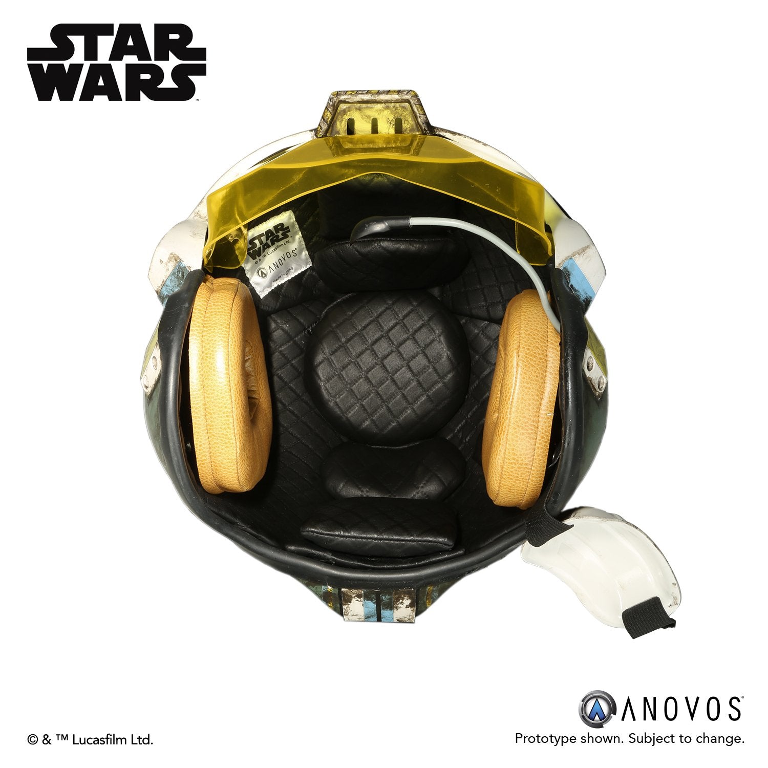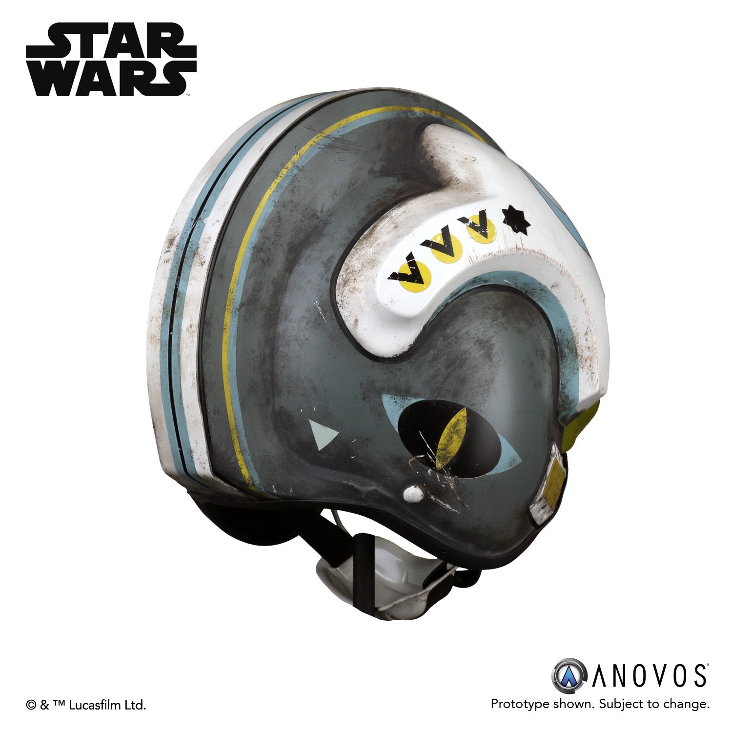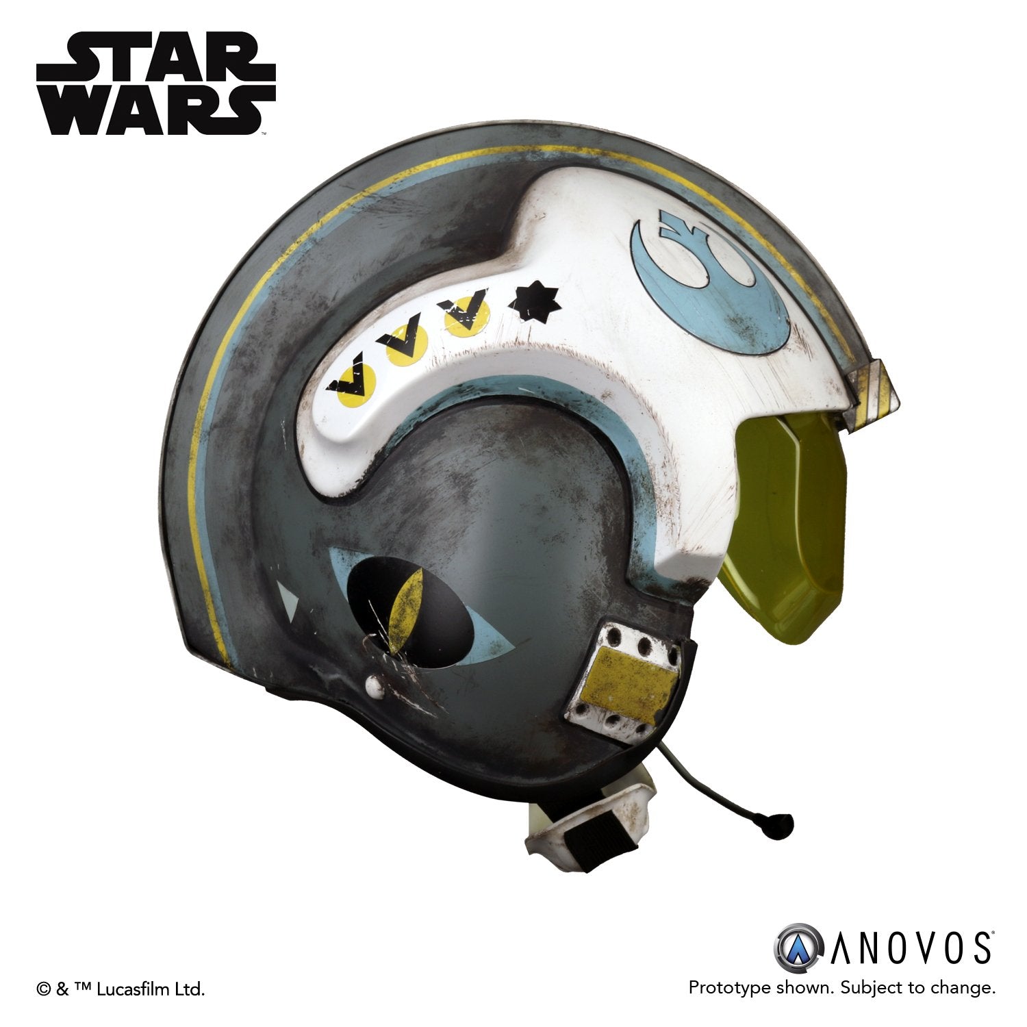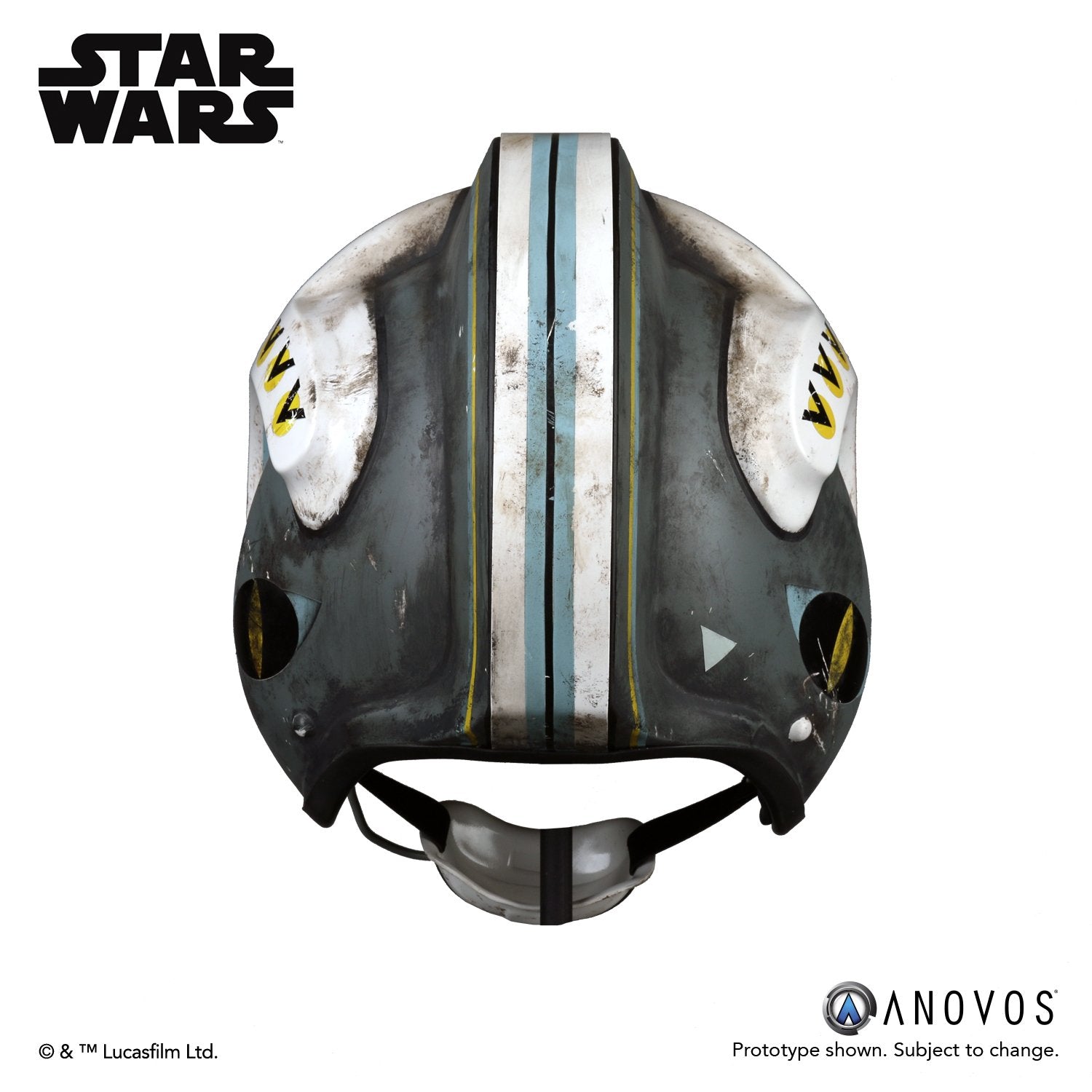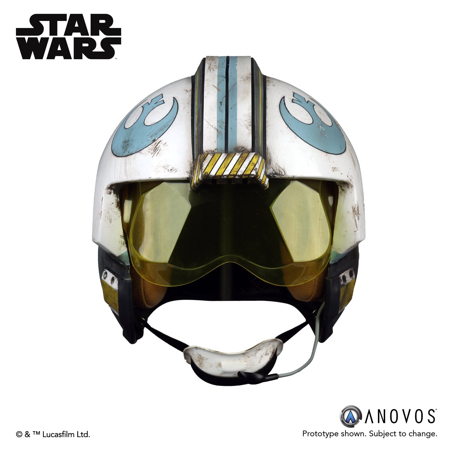 - The helmet is assembled and ready to wear with weathered finish and Blue Squadron markings.